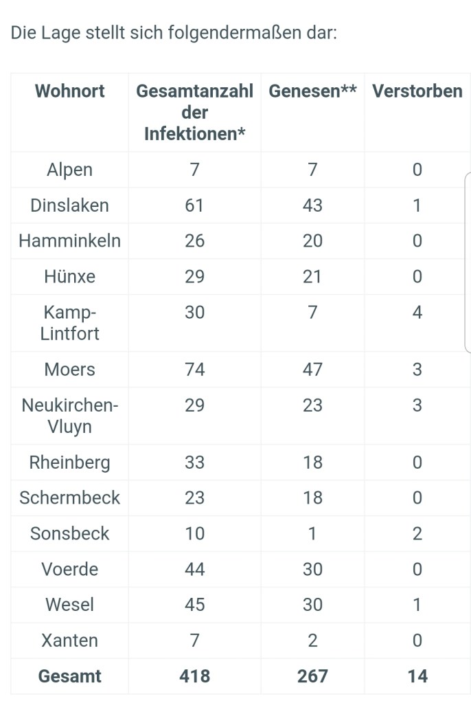 Die Anzahl der bestätigten Fälle von labordiagnostisch nachgewiesenen Infektionen mit dem Coronavirus (Covid-19) im Kreis Wesel liegt aktuell bei 418, Stand 16.04.2020, 12 Uhr. Zum Vergleich, Stand 15.04.2020, 12 Uhr = 409 Fälle