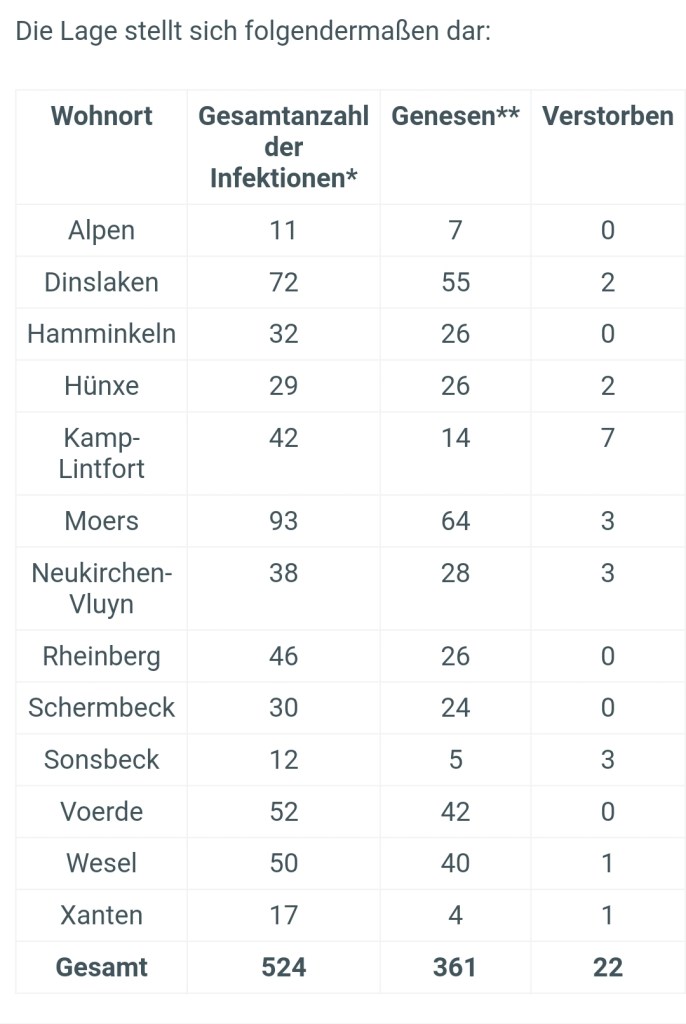 Die Anzahl der bestätigten Fälle von labordiagnostisch nachgewiesenen Infektionen mit dem Coronavirus (Covid-19) im Kreis Wesel liegt aktuell bei 524, Stand 30.04.2020, 12 Uhr. Zum Vergleich, Stand 29.04.2020, 12 Uhr = 513 Fälle.