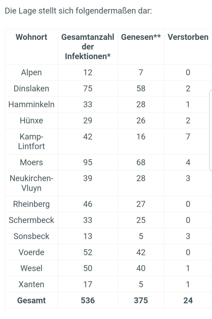 Die Anzahl der bestätigten Fälle von labordiagnostisch nachgewiesenen Infektionen mit dem Coronavirus (Covid-19) im Kreis Wesel liegt aktuell bei 536, Stand 02.05.2020, 10 Uhr. Zum Vergleich, Stand 30.04.2020, 12 Uhr = 524 Fälle.