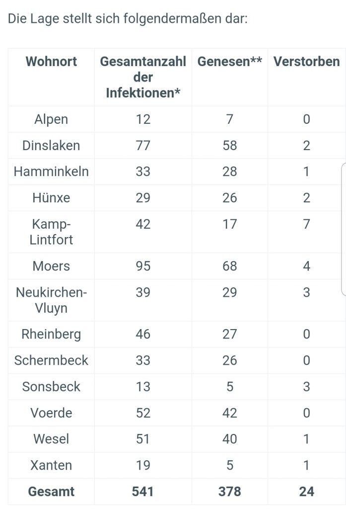 Die Anzahl der bestätigten Fälle von labordiagnostisch nachgewiesenen Infektionen mit dem Coronavirus (Covid-19) im Kreis Wesel liegt aktuell bei 541, Stand 04.05.2020, 12 Uhr. Zum Vergleich, Stand 02.05.2020, 10 Uhr = 536 Fälle.