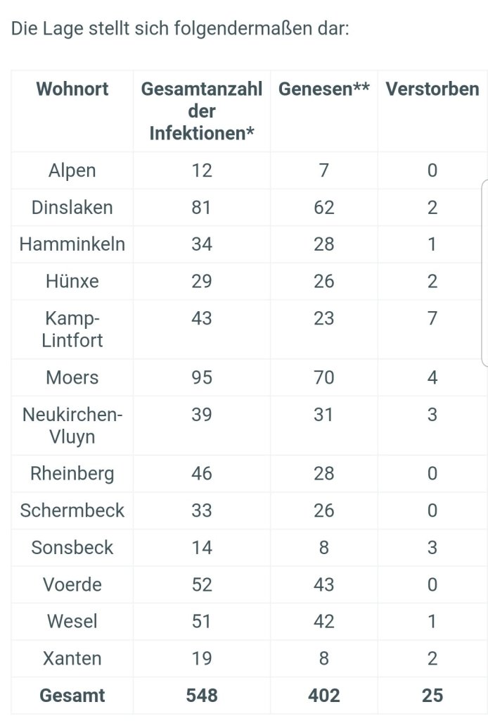 Die Anzahl der bestätigten Fälle von labordiagnostisch nachgewiesenen Infektionen mit dem Coronavirus (Covid-19) im Kreis Wesel liegt aktuell bei 548, Stand 06.05.2020, 12 Uhr. Zum Vergleich, Stand 05.05.2020, 12 Uhr = 545 Fälle.