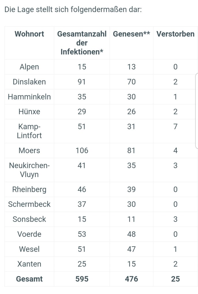 Die Anzahl der bestätigten Fälle von labordiagnostisch nachgewiesenen Infektionen mit dem Coronavirus (Covid-19) im Kreis Wesel liegt aktuell bei 595, Stand 15.05.2020, 12 Uhr. Zum Vergleich, Stand 14.05.2020, 12 Uhr = 586 Fälle.