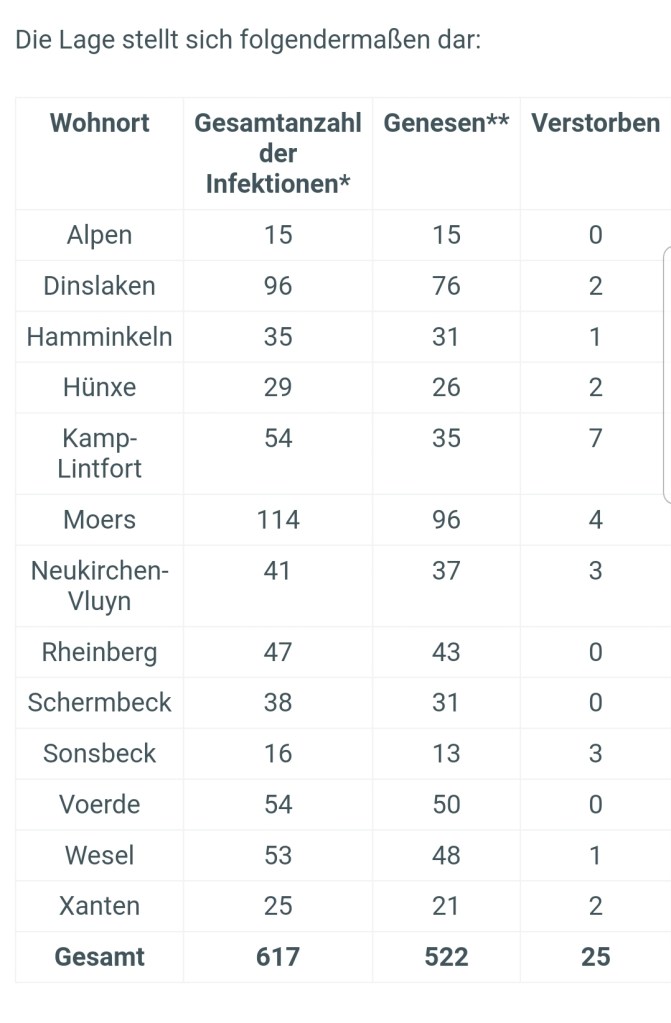Die Anzahl der bestätigten Fälle von labordiagnostisch nachgewiesenen Infektionen mit dem Coronavirus (Covid-19) im Kreis Wesel liegt aktuell bei 617, Stand 28.05.2020, 12 Uhr. Zum Vergleich, Stand 27.05.2020, 12 Uhr = 616 Fälle.