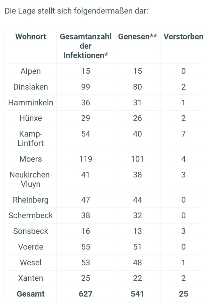 Die Anzahl der bestätigten Fälle von labordiagnostisch nachgewiesenen Infektionen mit dem Coronavirus (Covid-19) im Kreis Wesel liegt aktuell bei 627, Stand 03.06.2020, 12 Uhr. Zum Vergleich, Stand 02.06.2020, 12 Uhr = 626 Fälle.