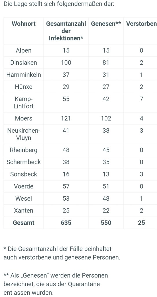 Die aktuelle 7-Tage-Inzidenz im Kreis Wesel liegt damit bei 2,8. Die 7-Tage-Inzidenz gibt an, wie viele Neuinfektionen innerhalb der letzten sieben Tage bezogen auf jeweils 100.000 Einwohner gemeldet wurden.