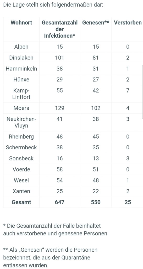 Die Anzahl der bestätigten Fälle von labordiagnostisch nachgewiesenen Infektionen mit dem Coronavirus (Covid-19) im Kreis Wesel liegt aktuell bei 647, Stand 08.06.2020, 12 Uhr. Zum Vergleich, Stand 05.06.2020, 12 Uhr = 635 Fälle.