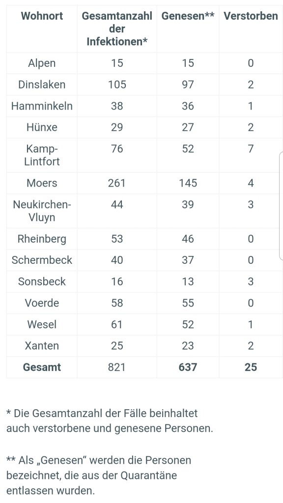 Die Anzahl der bestätigten Fälle von labordiagnostisch nachgewiesenen Infektionen mit dem Coronavirus (Covid-19) im Kreis Wesel liegt aktuell bei 821, Stand 06.07.2020, 12 Uhr. Zum Vergleich, Stand 03.07.2020, 12 Uhr = 797 Fälle.