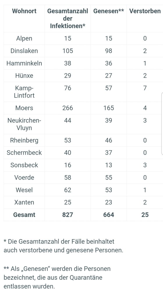 Die Anzahl der bestätigten Fälle von labordiagnostisch nachgewiesenen Infektionen mit dem Coronavirus (Covid-19) im Kreis Wesel liegt aktuell bei 827, Stand 08.07.2020, 12 Uhr. Zum Vergleich, Stand 07.07.2020, 12 Uhr = 822 Fälle.