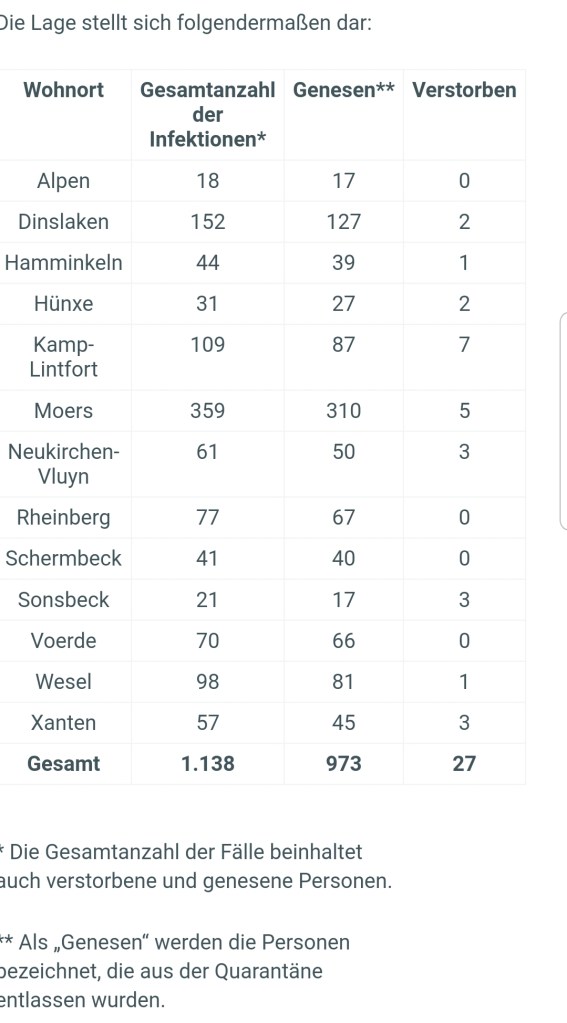 Die Anzahl der bestätigten Fälle von labordiagnostisch nachgewiesenen Infektionen mit dem Coronavirus (Covid-19) im Kreis Wesel liegt aktuell bei 1.138, Stand 20.08.2020, 12 Uhr. Zum Vergleich, Stand 19.08.2020, 12 Uhr = 1.131 Fälle.